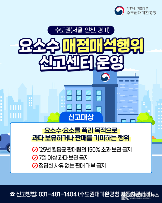 [ 한국미디어뉴스 이원영 기자 ] 기후에너지환경부 수도권대기환경청(청장 이상진)은 4월 1일부터 차량용 요소수 제조·수입·유통·판매사(주유소 등)을 대상으로 매점매석 행위와 같은 시장 교란 행위에 대해 집중 점검을 실시한다고 밝혔다.