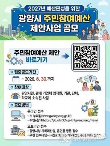 [ 한국미디어뉴스 이종철 기자 ] 광양시는 시민이 예산 편성 과정에 직접 참여할 수 있도록 6월 30일까지 ‘2027년 예산 반영 주민참여예산 제안사업’을 집중 공모한다고 밝혔다.