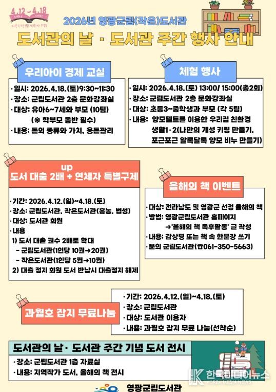 또한, 군립도서관과 작은도서관(홍농, 법성)에서는 ▲도서 대출 2배 up ▲연체자 특별구제 ▲과월호 잡지 나눔도 함께 진행한다.