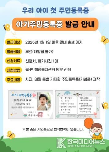 [ 한국미디어뉴스 김홍철 기자 ] 거창군은 소중한 아기의 출생을 기념하고 출산 장려를 위한 사회적 분위기를 조성하기 위해, 지난 2025년부터 시행 중인 ‘아기 주민등록증’ 무료 발급 서비스를 올해도 지속 추진하고 있다.