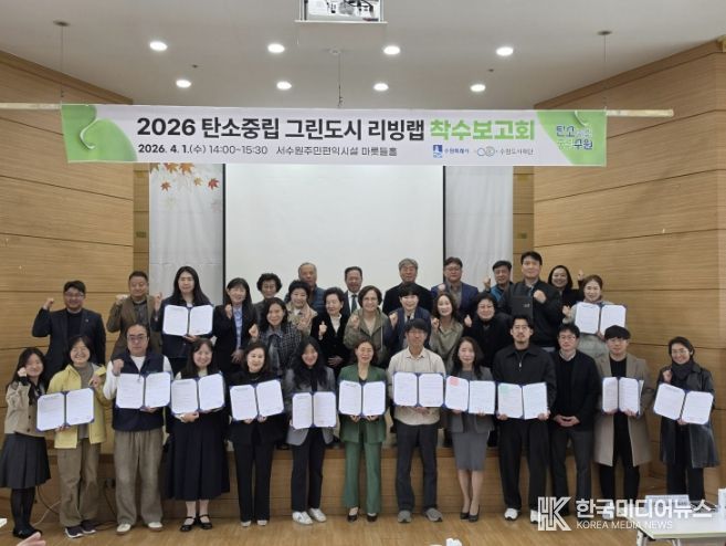 [ 한국미디어뉴스 김일규 기자 ] 수원특례시와 수원도시재단이 1일 서수원주민편익시설에서 ‘2026년 탄소중립 그린도시 리빙랩 착수보고회’를 열고, 탄소중립 그린도시 리빙랩 사업의 추진 방향을 알렸다.