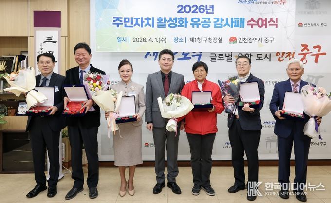 [ 한국미디어뉴스 최치남 기자 ] 인천시 중구는 ‘통합 1기 주민자치회’ 초기부터 현재까지 중구 주민자치 활성화에 헌신해 온 중구 주민자치협의회 소속 임원과 각 동 주민자치회장 등 총 8명을 대상으로 ‘감사패’를 수여했다고 3일 밝혔다.