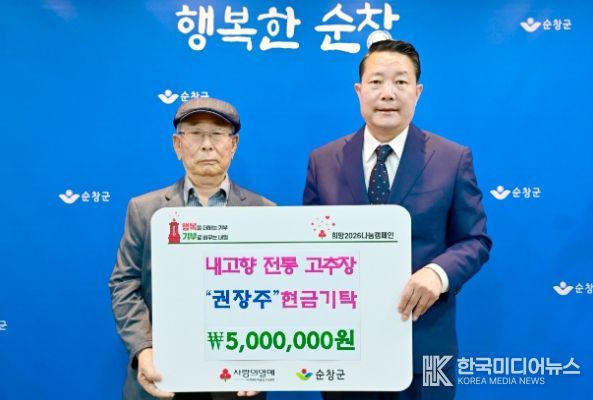[ 한국미디어뉴스 이종철 기자 ] 순창군 민속마을에 위치한 내고향 전통 고추장 대표 권장주·양내승 부부는 최근 순창군청을 방문해 지역의 어려운 이웃을 위해 사용해 달라며 성금 500만 원을 기탁해 지역사회에 따뜻한 감동을 전했다.