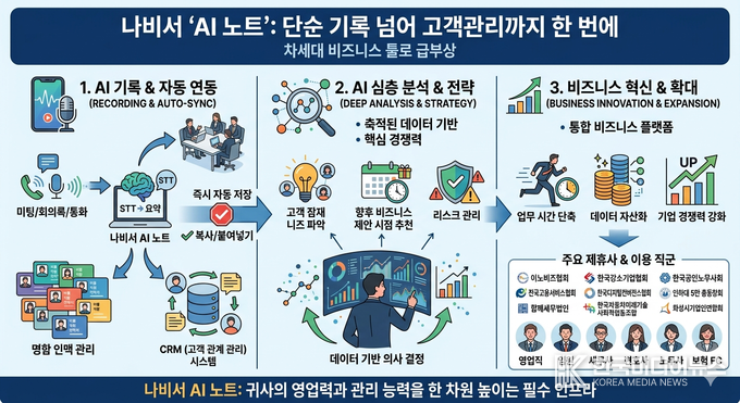 [ 한국미디어뉴스 김일규기자 ] 최근 직장인들 사이에서 AI 기반 회의록 서비스가 업무 도구로 자리 잡고 있다. 이 가운데 ‘나비서 AI 노트’는 단순 음성 텍스트 변환을 넘어 명함 관리와 고객 관계 관리(CRM) 시스템과 결합해 업무 효율성 강화에 주목받고 있다.