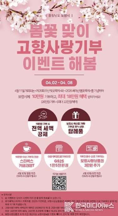 [ 한국미디어뉴스 이원영 기자 ] 보령시가 제20회 주산 벚꽃축제와 2026 옥마산 봄꽃축제를 맞아 오는 4월 8일까지 ‘봄꽃 맞이 고향사랑기부 이벤트 해봄’을 진행한다.