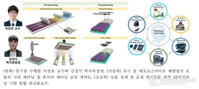 현재 유기 및 페로브스카이트 태양전지는 실험실 수준의 소면적 셀에서 각각 19.2%와 27.0%라는 높은 효율을 달성했으나, 상업화를 위한 대면적 모듈(>10 cm2) 제작 시 효율이 20~30% 급격히 저하되는 ‘Cell-to-Module’ 효율 격차가 가장 큰 걸림돌이었다. 이진호 교수팀은 이러한 문제를 해결하기 위해 필수적인 모듈 구조 설계와 정밀 패터닝 기술을 체계적으로 분석하였다.