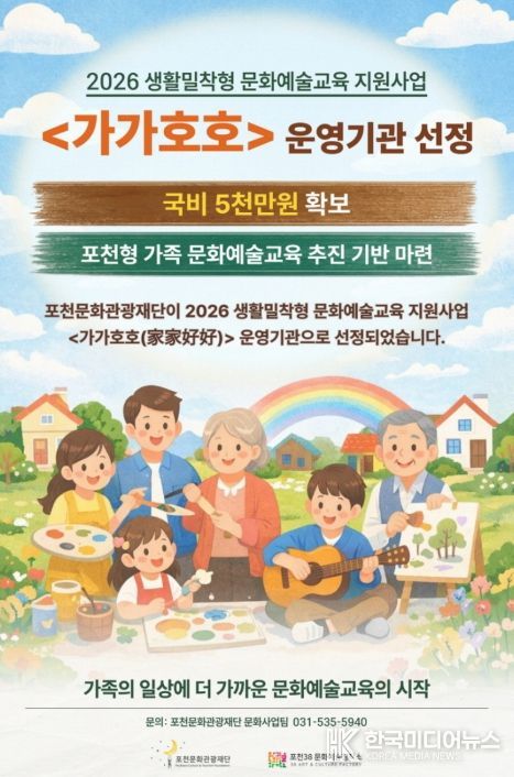 [ 한국미디어뉴스 김서안 기자 ] 포천문화관광재단이 2026 생활밀착형 문화예술교육 지원사업 ‘가가호호(家家好好)’ 운영기관 공모에 최종 선정됐다.