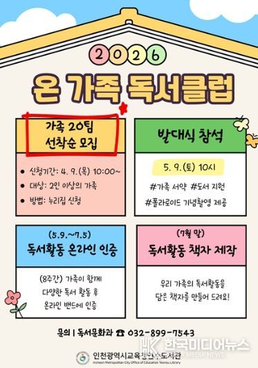 [ 한국미디어뉴스 이원영 기자 ] 인천광역시교육청연수도서관은 5월 9일부터 가족이 함께 책을 매개로 소통하며 성장하는 ‘온 가족 독서클럽’을 운영한다.