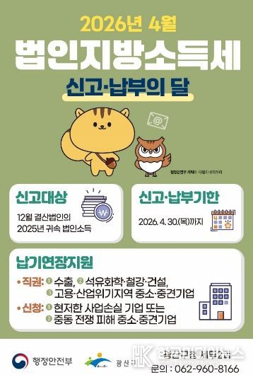 [ 한국미디어뉴스 이종철 기자 ] 광주 광산구가 지역 내 사업장을 둔 법인을 대상으로 2025년 귀속 법인지방소득세 확정신고 기간을 30일까지 운영한다.