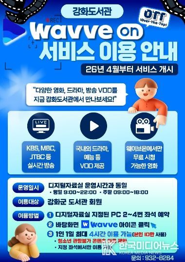 [ 한국미디어뉴스 이기선 기자 ] 강화군은 오는 4월 7일부터 강화도서관 디지털자료실에서 OTT 영상 스트리밍 서비스인 ‘웨이브온(Wavve on)’을 이용할 수 있다고 밝혔다.