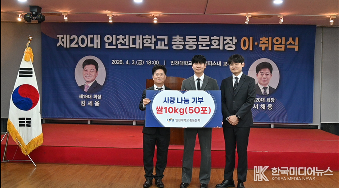 제20대 회장으로 취임한 서해용 신임 회장은 토목공학과 82학번 출신으로, 평소 탁월한 리더십과 포용력을 바탕으로 동문 사회에서 두터운 신망을 받아왔다. 특히 이번 취임식에서는 행사 참석자들이 기존의 축하 화환이 아닌 쌀 화환을 기증하여 행사의 의미를 더해주었다. 이에 총동문회는 기증받은 쌀 화환 50포를 총학생회에 전달하면서 ‘인천대 재학생 천원의 아침밥’사업에 동문들의 온정을 전했고, 지역 내 복지단체에도 잔여 쌀 화환을 전달하면서 나눔의 가치를 실천하겠다는 계획이다.