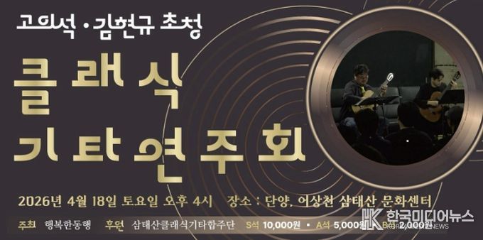 [ 한국미디어뉴스 김풍옥 기자 ] 단양군 어상천 지역에서 활동하는 삼태산 클래식기타 합주단은 공연기획단체 행복한 동행(대표 홍원의)과 함께 오는 18일 오후 4시 어상천 삼태산문화센터에서 ‘고의석·김현규 초청 클래식기타 연주회’를 개최한다.
