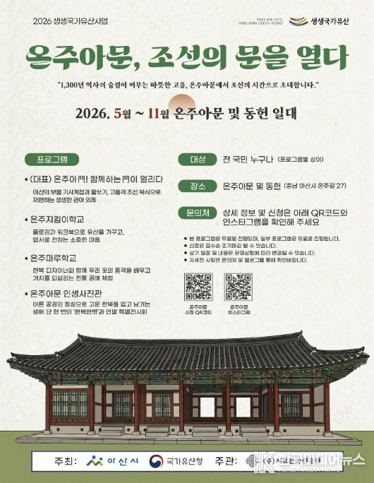 [ 한국미디어뉴스 이원영 기자 ] 아산시는 ‘2026년 아산 방문의 해’를 맞아 국가유산인 온주아문과 동헌 일원을 활용한 ‘생생 국가유산 사업’을 본격 추진하며 시민들에게 특별한 역사·문화 체험 기회를 제공한다.