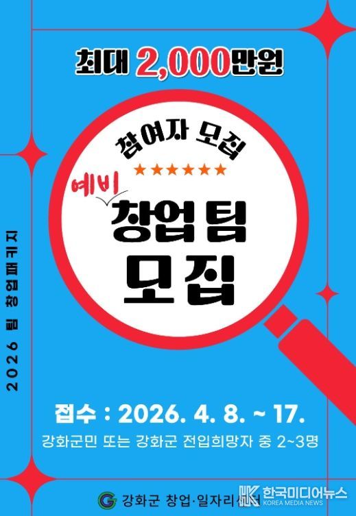 [ 한국미디어뉴스 이기선 기자 ] 강화군 창업·일자리센터가 '2026년도 팀 창업패키지 지원사업' 참여자를 모집한다.