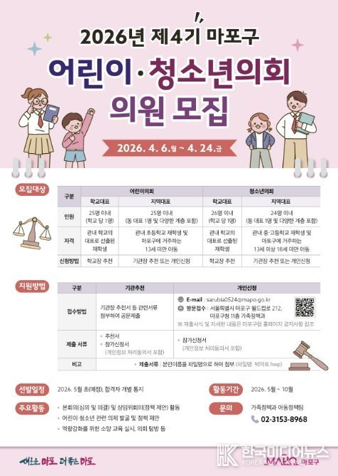 [ 한국미디어뉴스 이원영 기자 ] 마포구는 4월 6일부터 24일까지 ‘제4기 어린이·청소년의회’ 위원을 모집한다.
