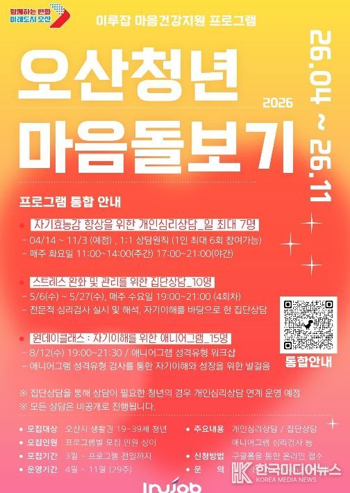 [ 한국미디어뉴스 이보영 기자 ] 오산시는 청년공간 ‘이루잡’이 지역 청년들의 정신건강 증진을 위해 ‘2026 오산청년 마음돌보기’ 프로그램을 오는 4월 14일부터 11월까지 운영한다고 밝혔다.