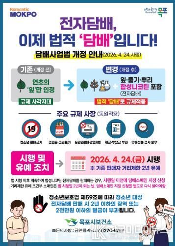 [ 한국미디어뉴스 이종철 기자 ] 목포시는 '담배사업법' 개정 시행에 따라 액상형 전자담배가 공식적인 규제 대상에 포함됐음을 알리고 시민들의 주의를 당부했다.