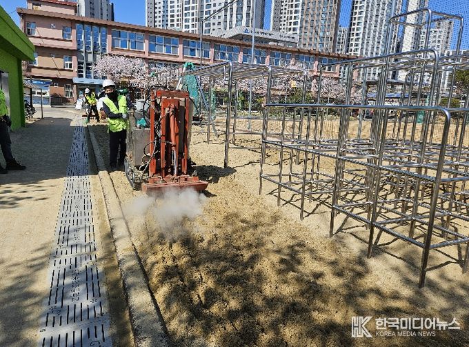 특히 전문 업체에서 놀이기구와 바닥재를 고온·고압의 스팀으로 소독하고 모래 바닥재 기생충(란) 검사도 병행 지원하여 학교 행정업무 부담이 경감될 것으로 기대된다.