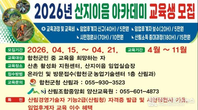 [ 한국미디어뉴스 김홍철 기자 ] 합천군은 임업 전문인력 양성과 산림소득 증대를 위해 ‘2026년 산지이음 아카데미’교육생을 모집한다고 9일 밝혔다.