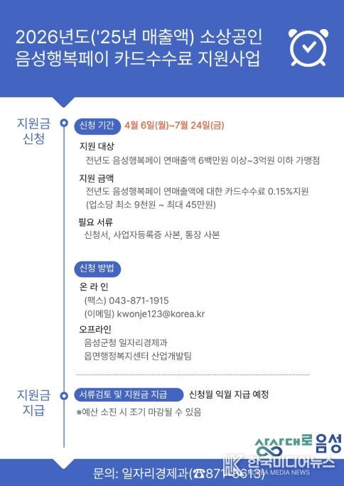[ 한국미디어뉴스 김풍옥 기자 ] 음성군이 고물가·고금리로 인한 관내 소상공인 경영 부담 완화를 위해 ‘음성행복페이 카드수수료 지원사업’을 추진하고 있다.