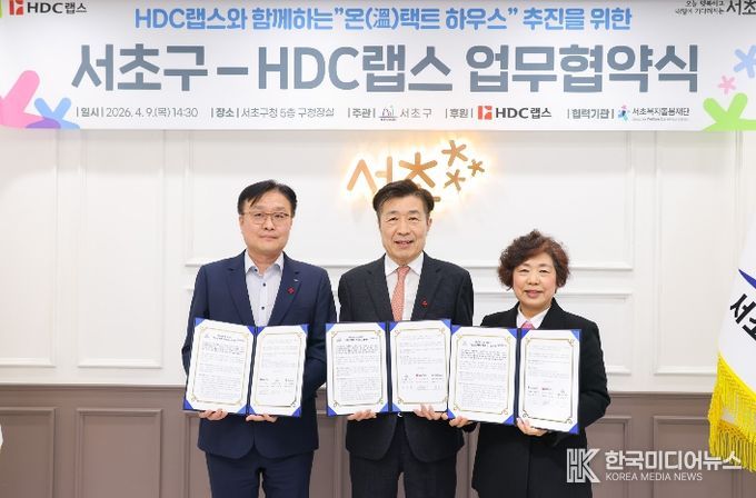[ 한국미디어뉴스 이보영 기자 ] 서울 서초구는 9일 서초구청 5층 구청장실에서 HDC랩스와 저소득 가구 대상 주거환경 개선 추진을 위한 ‘온(溫)택트 하우스’ 업무협약을 체결했다고 밝혔다.