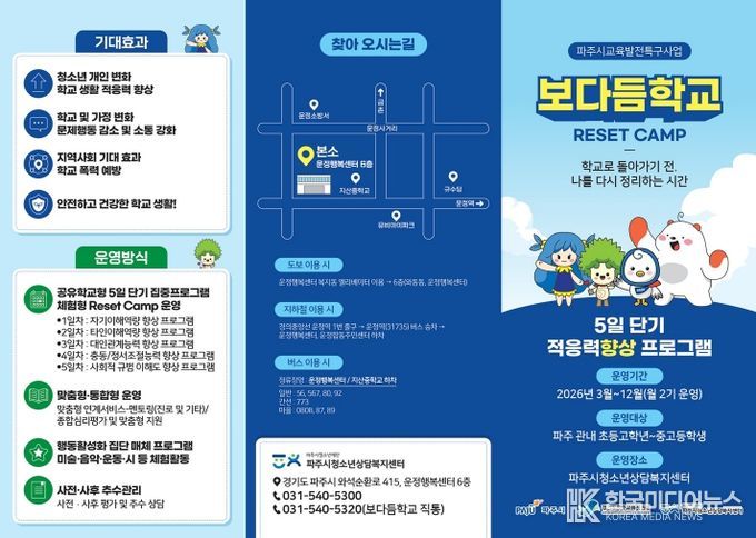 [ 한국미디어뉴스 기자 ] 파주시가 심리·정서적 이유로 학업에 어려움을 겪는 학생들의 심리 안정과 건강한 학교생활 복귀를 돕기 위해 교육발전특구 시범사업인 ‘보다듬학교’를 본격적으로 운영하며, 핵심 프로그램인 ‘리셋캠프(Reset Camp)’참여자를 모집한다.
