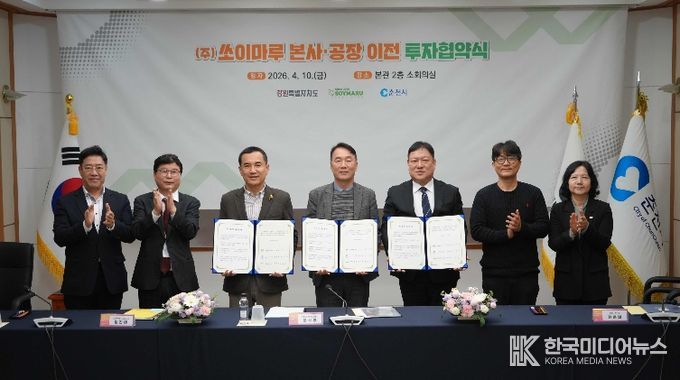 [ 한국미디어뉴스 이원영 기자 ] 춘천시와 강원특별자치도, ㈜쏘이마루가 10일 강원도청 본청에서 3자 투자협약식을 개최했다.
