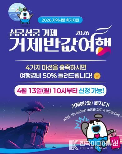 [ 한국미디어뉴스 김홍철 기자 ] 거제시는 관광객 유치 확대와 지역경제 활성화를 위해‘2026년 심쿵섬쿵 거제 반값여행’ 시범사업을 추진한다고 밝혔다.