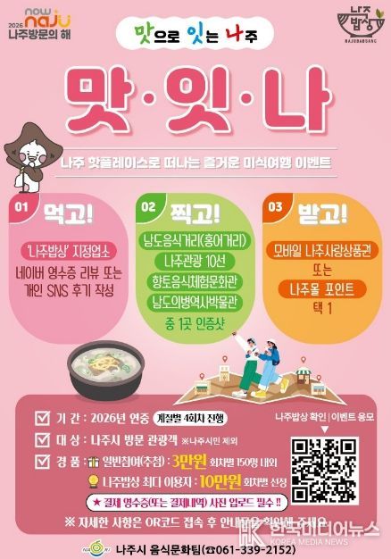 [ 한국미디어뉴스 이종철 기자 ] 전남 나주시가 ‘2026 나주방문의 해’를 맞아 시 대표 음식 브랜드인 ‘나주밥상’을 앞세운 사계절 미식 이벤트 ‘맛으로 잇는 나주, ‘맛잇나’의 2회차(봄) 운영을 본격적으로 시작한다.