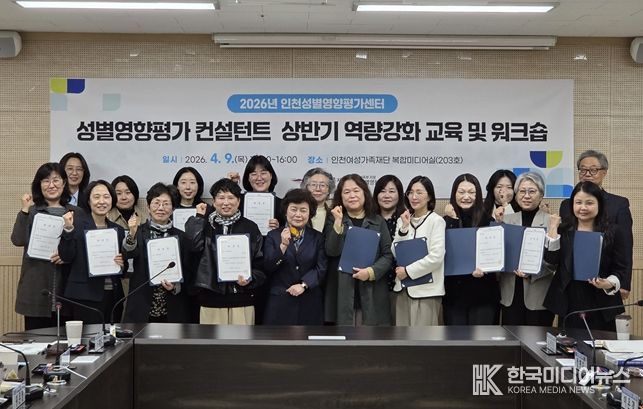 [ 한국미디어뉴스 이원영 기자 ] 인천여성가족재단 성평등가족부 지정 인천성별영향평가센터는 4월 9일 재단 내 복합미디어실에서 ‘2026년 상반기 인천광역시 성별영향평가 컨설턴트 역량강화 교육 및 워크숍’을 개최했다.