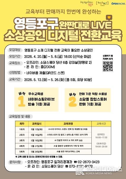 교육은 영등포구 소재 소상공인을 대상으로 5월 12일부터 26일까지 총 5회에 걸쳐 온·오프라인으로 동시에 진행되며, 오프라인 교육은 소담스퀘어 당산(양평로 2) 6층 강의실에서 진행된다.