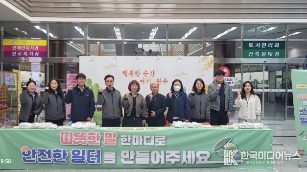 [ 한국미디어뉴스 이원영 기자 ] 원주시는 지난 9일 시청 로비에서 안전보건공단 강원지역본부, 고용노동부 원주지청과 함께 ‘고객응대근로자 보호 합동 캠페인’을 전개했다.