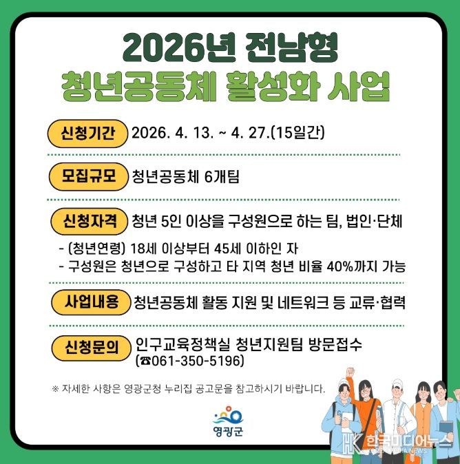 [ 한국미디어뉴스 이종철 기자 ] 영광군은 청년들의 지역 활동 기반을 마련하고 지역사회 활동 주체로 성장할 수 있도록 지원하기 위해 오는 4월 27일까지 ‘2026년 전남형 청년공동체 활성화 사업’ 참여팀을 모집한다고 밝혔다.
