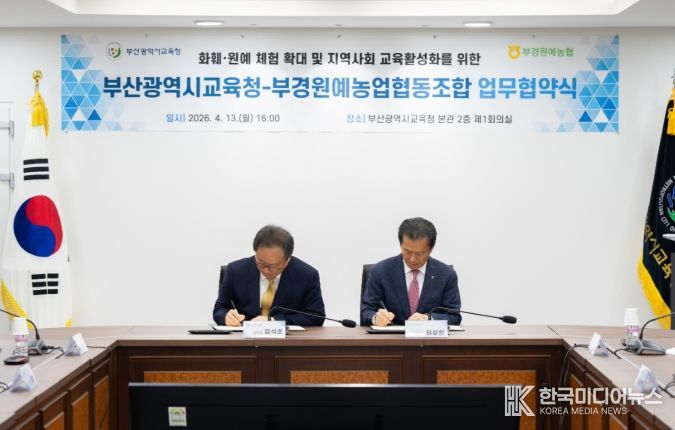 [ 한국미디어뉴스 이원영 기자 ] 부산광역시교육청은 지난 13일 시교육청 제1회의실에서 부경원예농업협동조합(조합장 최성환)과 ‘지역사회 교육활성화를 위한 원예체험 프로그램 운영’ 업무 협약을 체결했다고 밝혔다.