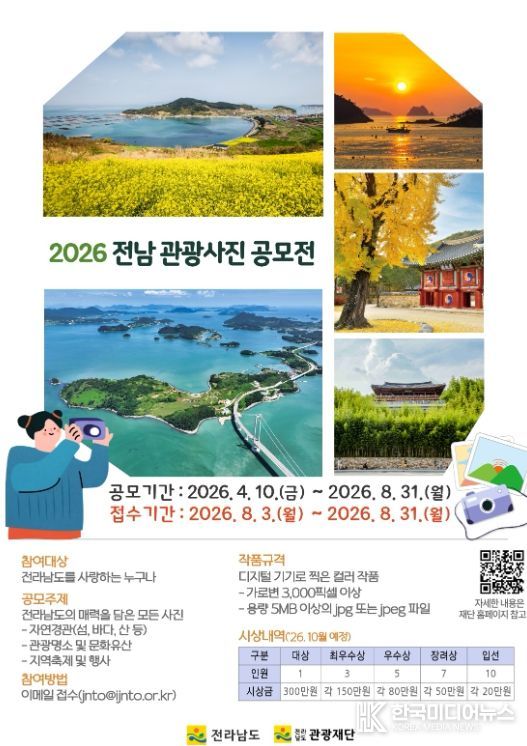 [ 한국미디어뉴스 이종철 기자 ] 전라남도는 자연경관과 관광지, 축제 등 지역의 다양한 매력을 널리 알리고 수준 높은 사진 콘텐츠를 발굴하기 위해 ‘2026년 전남 관광사진 공모전’을 추진한다.