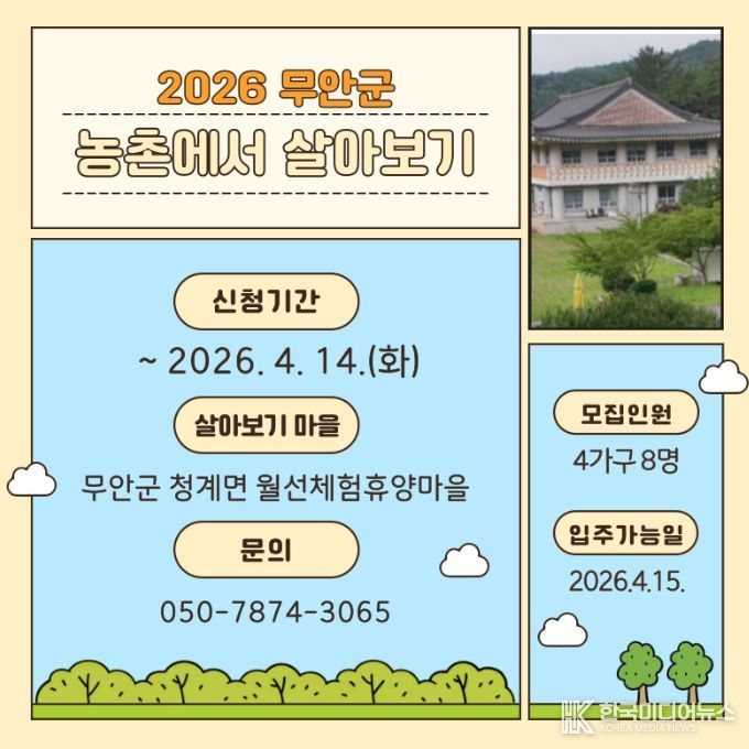 [ 한국미디어뉴스 이종철 기자 ] 무안군은 귀농귀촌을 희망하는 도시민의 안정적인 농촌 정착을 지원하기 위해 ‘2026년 전남(무안)에서 살아보기’ 프로그램을 운영하고 참가자를 모집한다고 밝혔다.