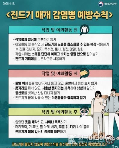순창군보건의료원 관계자는 “야외활동 후 2주이내 발열, 구토, 설사 등 증상이 나타나면 즉시 의료기관을 방문해 야외활동력을 알리고 진료를 받아야 한다”며 “농업인과 야외활동이 많은 주민은 예방수칙을 꼭 준수해 달라”고 강조했다.