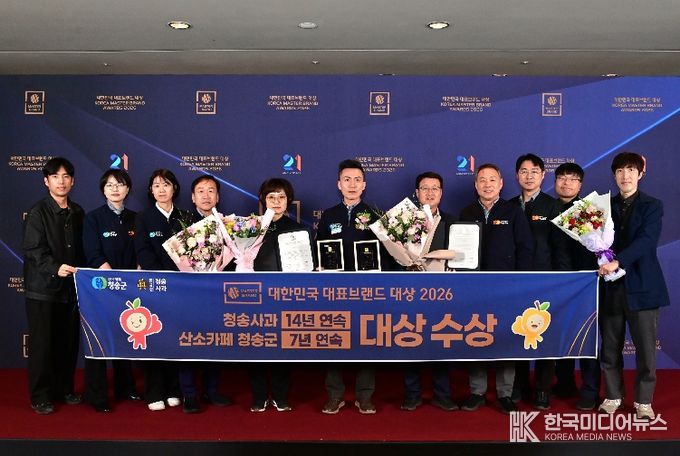 [ 한국미디어뉴스 이보영 기자 ] 청송군은 14일 열린 ‘2026 대한민국 대표브랜드 대상 시상식’에서 사과 브랜드 부문 '청송사과'가 14년 연속 대상, 도시 브랜드 부문 '산소카페 청송군'이 7년 연속 대상을 수상했다고 밝혔다.