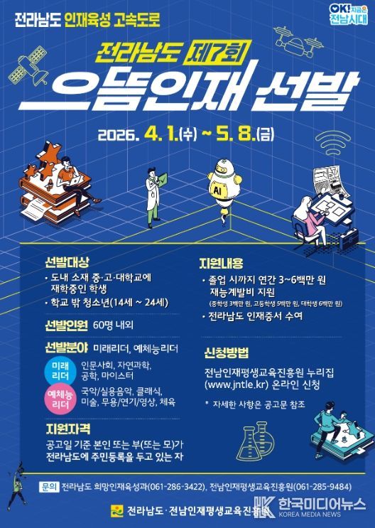 [ 한국미디어뉴스 이종철 기자 ] 전라남도가 미래 인재를 발굴·육성하기 위해 ‘제7회 전라남도 으뜸인재 선발’ 참여자를 공개 모집해 60명에게 최대 600만 원을 지원한다.
