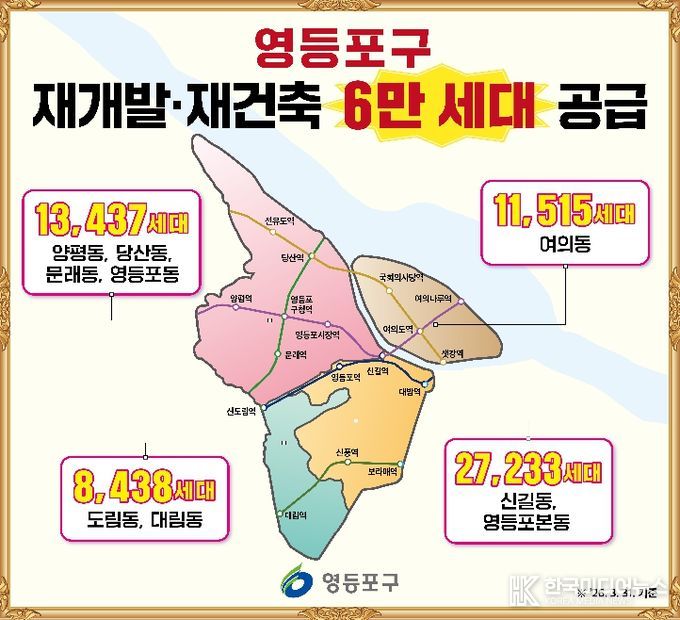 [ 한국미디어뉴스 이원영 기자 ] 영등포구가 관내 재개발‧재건축 사업을 통해 총 6만 세대 규모의 주택 공급을 추진하며, 서울 도심 속 명품 주거단지 조성에 박차를 가하고 있다고 밝혔다.