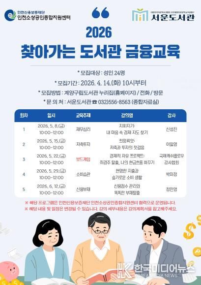 [ 한국미디어뉴스 황영수 기자 ] 인천시 계양구 서운도서관은 지역주민의 실생활 금융역량 강화를 위해 오는 5월 8일부터 6월 12일까지 성인을 대상으로 ‘2026 찾아가는 도서관 금융교육’을 운영한다고 밝혔다.