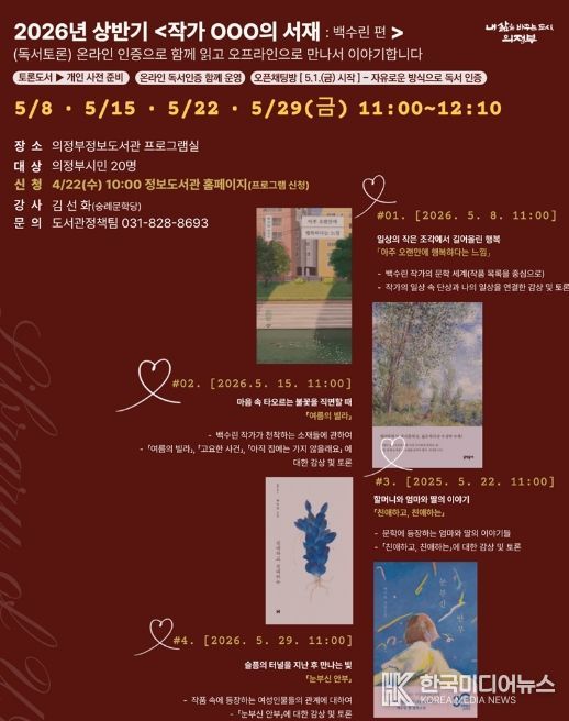 [ 한국미디어뉴스 기자 ] 의정부시는 2026년 상반기 ‘작가 OOO의 서재: 백수린 편’을 5월 매주 금요일(8일, 15일, 22일, 29일) 총 4회에 걸쳐 의정부정보도서관에서 운영한다.