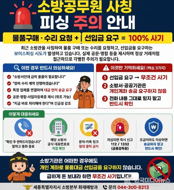 [ 한국미디어뉴스 이원영 기자 ] 세종특별자치시 소방본부가 17일 최근 소방공무원을 사칭해 소방시설 점검이나 물품 구매를 강요하며 선입금을 유도하는 보이스피싱 시도가 지속되고 있는 것과 관련해 주의를 당부했다.