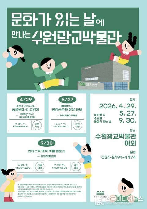 [ 한국미디어뉴스 김일규 기자 ] 수원광교박물관은 4·5·9월 ‘문화가 있는 날’(매달 마지막 주 수요일)에 박물관 야외에서 어린이와 가족 관람객을 위한 무료 공연을 연다.
