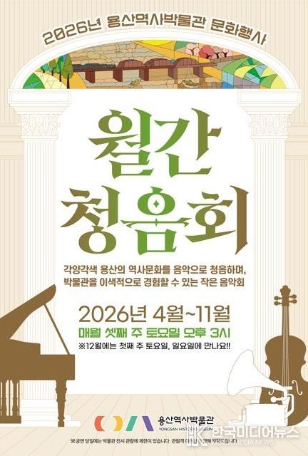 박희영 용산구청장은 “용산역사박물관 월간 청음회는 박물관을 관람하며 용산의 역사 문화를 음악으로 듣는 특별한 경험이 될 것”이라며 “매월 진행하는 공연을 통해 바쁜 일상의 지친 마음을 치유할 수 있길 바라며, 앞으로도 모두가 용산 역사문화를 즐길 수 있는 다양한 문화 향유 프로그램을 마련하겠다”라고 밝혔다.