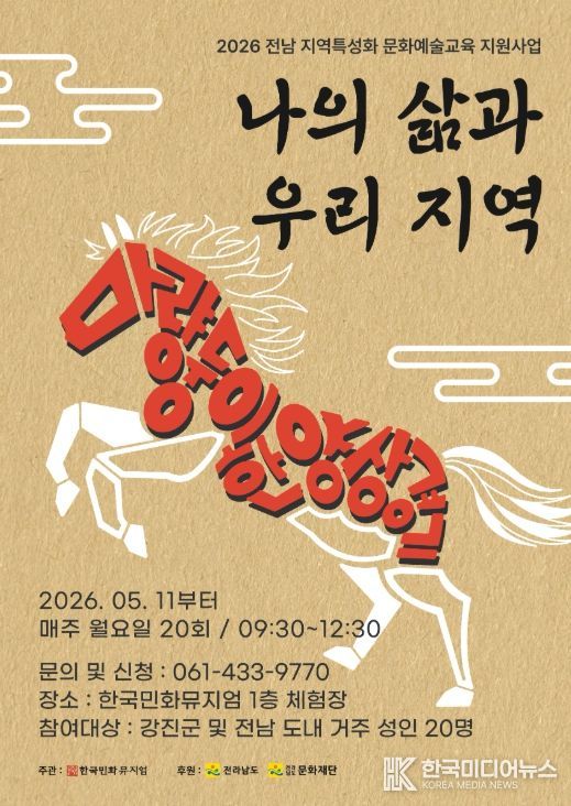 [ 한국미디어뉴스 이종철 기자 ] 강진군 대구면에 있는 한국민화뮤지엄이 ‘2026 지역특성화 문화예술교육 지원사업’ 선정에 따라 오는 5월 11일부터 ‘나의 삶과 우리 지역–마량둥이의 한양 상경기’ 프로그램 운영을 시작하며 참가자를 모집한다.
