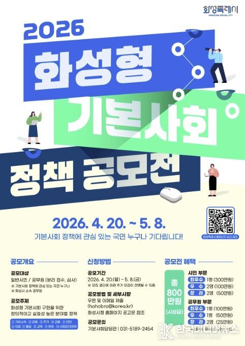 [ 한국미디어뉴스 이원영 기자 ] 화성특례시는 시민 참여 기반을 확대하고, 실효성 있는 기본사회 정책을 발굴하기 위해 '2026년 화성형 기본사회 정책 공모전'을 개최한다고 밝혔다.
