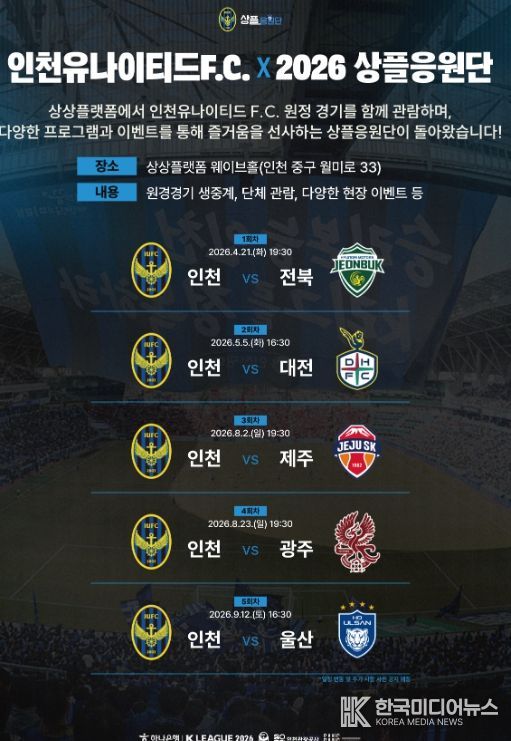 [ 한국미디어뉴스 이원영 기자 ] 인천관광공사는 인천유나이티드와 함께 ‘인천유나이티드F.C. X 2026 상플응원단’을 공동 개최한다고 밝혔다.