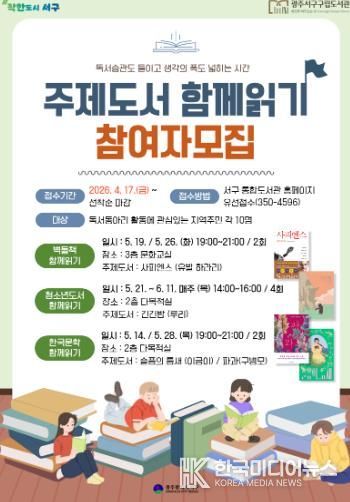 [ 한국미디어뉴스 이종철 기자 ] 광주광역시 서구는 주민들의 독서 진입장벽을 낮추기 위해 ‘착한독서법’을 기반으로 한 ‘함께읽기’ 프로그램을 5월부터 본격 운영한다.