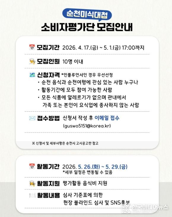 [ 한국미디어뉴스 이종철 기자 ] 순천시는 오는 5월 개최 예정인 '제11회 순천미식대첩'을 앞두고, 소비자 블라인드 심사에 참여할 ‘소비자 평가단’을 4월 17일부터 5월 1일까지 모집한다고 밝혔다.